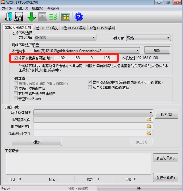 勾选“设置下载设备网络地址”设置运动控制器IP,输入192.168.0.135