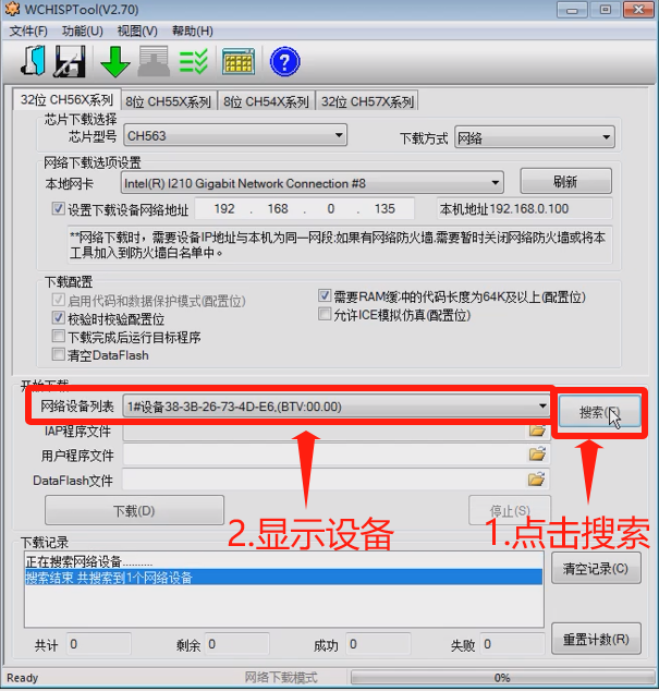 点击搜索,稍等几秒后在网络设备列表会显示设备