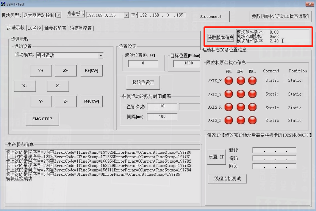 点击搜索,程序自动选择IP为192.168.0.135的运动控制器(实际操作时候可能会因为现场情况,IP会有细微不同)
