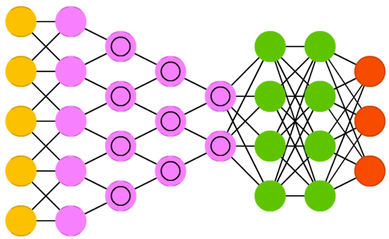图3显示了CNN背后的典型设计。首先,可以使用具有多个维度的图像或音频文件作为输入(黄色圆圈)。然后将执行一系列卷积运算,以便在多个层(粉色圆圈)上简化或“卷积”输入,并将一系列卷积运算的输出馈送到神经网络中。根据Van Veen(绿色圆圈),分析卷积输出的神经网络通常是前馈神经网络。