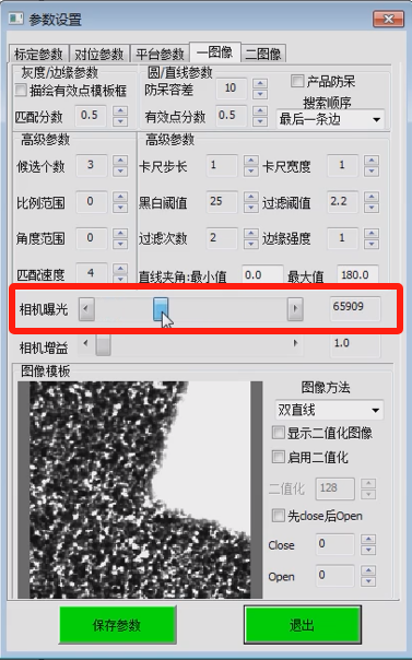 相机曝光:拖动滑块改变曝光时间数值,曝光时间越短,图片越暗,反之如果时间越长,图片就越亮,但相对应的取相时间也越长,调节到合适的数值之后,记得点击保存参数