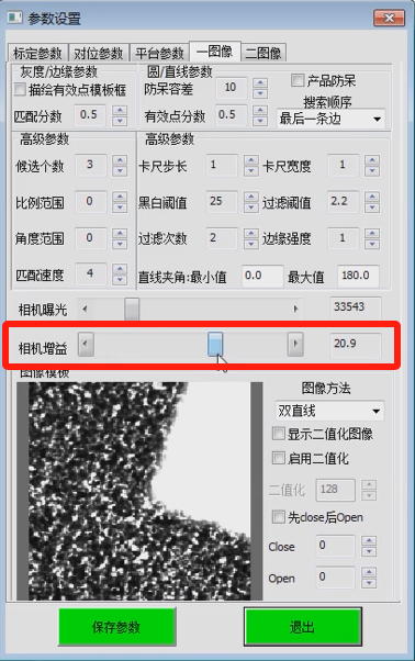 相机增益:相机感光芯片的参数,以2的N次方增加亮度,调整比较灵敏并且会带来噪点,默认值是1,增益数值越大,亮度就会越高,但同时早点与雪花就会变大,调节时要注意不能调节过高导致雪花噪点过多。