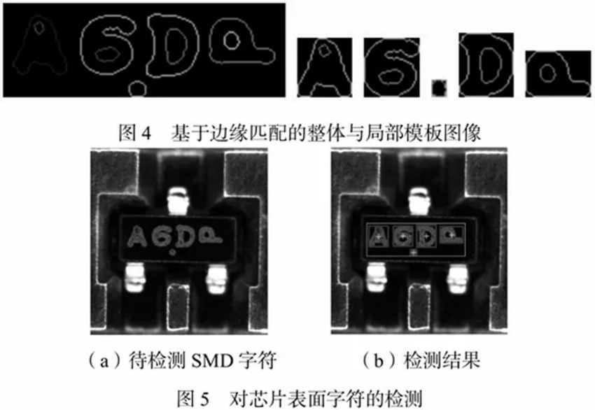 字符缺陷识别采用基于边缘特征的模板匹配。模板匹配的基本思想是让模板在目标图像中做平移运动,将模板左上角和待检测的图像左上角重合,每移动一个像素,计算模板与待匹配图像的相似度,遍历结束之后,将符合阈值的位置认定为最佳匹配位置。基于灰度的互相关模板匹配是通过用模板图像遍历待匹配图像,每移动一个像素,计算对应部分的互相关值,将互相关值的最大值作为最佳匹配位置。基于灰度的互相关模板匹配缺点是在光场不均匀情况下,不具有鲁棒性。归一化互相关系数法是一个亮度、对比度线性不变量,能够明显改善光照的线性变化带来的影响。但是随着图像分辨率的提高,图像匹配的时间会增加,匹配准确度也存在差异,甚至会发生匹配失效的情况,并且由于半导体芯片的位姿和完整性等存在差异,会引起光照的非线性变化,这会导致图像的灰度差异大,进而导致模板匹配结果不准确。较于基于灰度的互相关模板匹配,基于边缘的模板匹配不需要建立两幅图像之间点的对应关系,具有较好的鲁棒性。模板由目标图像边缘的一系列点组成,如下图。