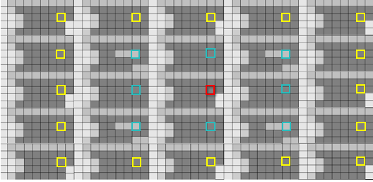 此外,缺陷部分是否上报时,系统算法主要有增加比对次数和范围(Multicheck)。增加对比次数,也就是比对的维度从一维扩展到二维,甚至三维。以下图为例,当要判定红色单元是否为缺陷时,通常的算法是纵向或横向的一维比较,随着算法的逻辑关系的不断优化,先进行纵向重复模板对比,再增加横向,对角线,甚至更外围的模板比较,可以大大提高检测结果的准确度。