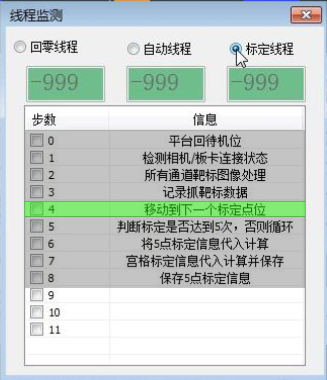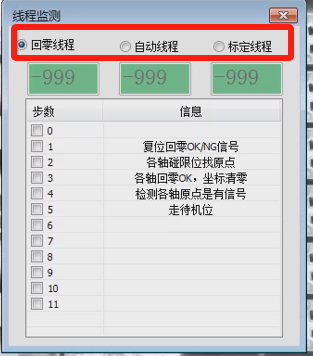 线程监测界面:监控软件当前流程的执行步数状态:回零、自动运行、标定三种,方便出现问题查看问题停滞的状态。