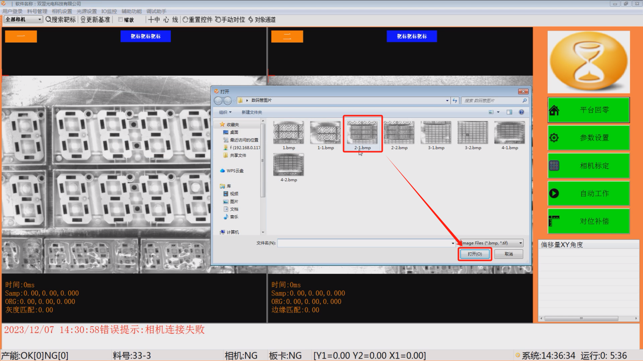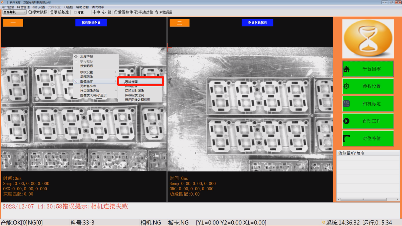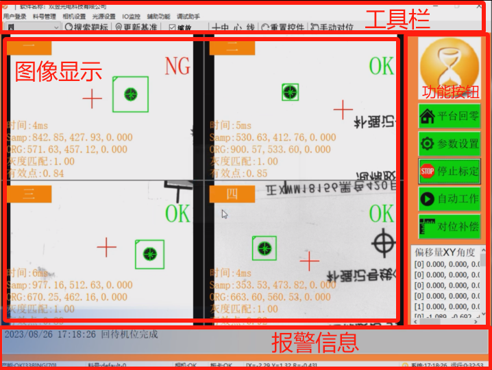 运行WiseAlign.exe程序,进入软件可以看到,主界面主要分4个区域(左上角:工具栏;右侧:功能按钮;中间:图像显示;下侧:报警信息)
