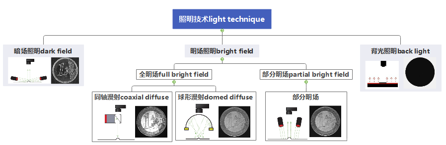 入射角是非常重要因素,据此机器视觉照明划分为明场(brightfield),暗场(darkfield)和背光(backlight),再考虑光束方向性,可分为全明场和部分明场,分类图如下