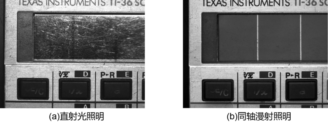 全明场有较大立体角,光源从多个方向照射到物体表面,会产生无方向、柔和的反射光。如下图所示,当采用直射光照明时,由于光线存在方向性,金属和屏幕上的划痕等有很强的反光成像效果。当采用漫射照明时,物体表面被相对均匀照射,虽然金属表面的划痕仍能看到,但屏幕上的小划痕已经看不清楚了。漫射照明适合于高反光平整材质物体,可以消除小的变形、褶皱影响,只对边缘和比较大的曲面有对比度差异成像效果。