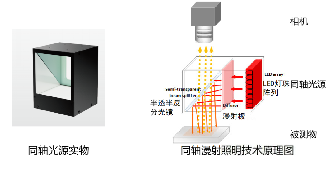 同轴照明是与相机轴向有相同的方向的光照射到物体的表面。同轴照明使用一种特殊的半反射镜面反射光源到摄像头的透镜轴方向。光源通过漫射板(diffusor)发散打到半透半反分光镜(semi-transparentbeamsplitter)上,该分光片将光反射到物体上,再由物体反射到镜头中。由于物体反射后的光与相机处于同一个轴线上,因此,此种方式的光源被称之为同轴光。同轴照明技术对于实现扁平物体且有镜面特征的表面的均匀照明很有用。