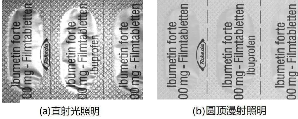 圆顶漫射非常适合于表面不平整的光滑表面物体的高质量成像。一个应用例子为印刷质量检测,包装表面有褶皱和凸起不平整,圆顶漫射照明可以抑制表面不平整等外观结构干扰特征,只留下清晰的印刷字体信息,使得表面成像效果一致。