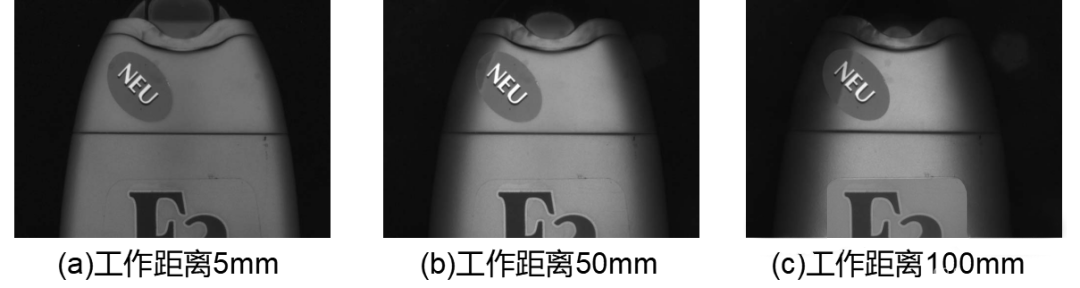 此种照明技术应用限制为工作距离,为了确保均匀照明,工作距离必须尽可能地近些,工作距离越长,光束的方向性越强,漫射均匀性降低。如下图所示,当光源工作距离为5mm时,边缘弧面区域近乎均匀照亮,当工作距离逐渐增加时,越来越多的边缘区域没有被照亮,边缘区域照明均匀一致性消失。