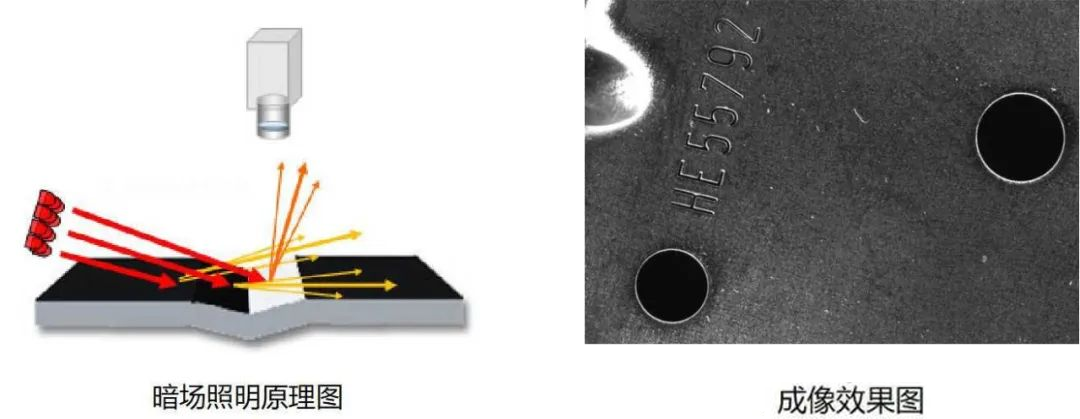 光源以小于45度的入射角照射物体表面。用这种照射方法,根据光学反射定律,所有的反射光线都无法到达相机,视觉系统什么都看不到,为黑色。但可以更加凸显边缘和划痕等特征。