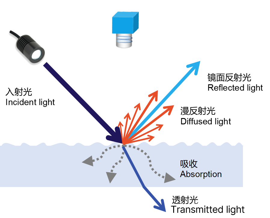在表面检测中,我们可以粗略的把目标上的缺陷分为两类:几何形状缺陷和表面强度(密度)缺陷。几何形状缺陷包含凹坑、划痕、裂纹、毛刺、凸起、擦伤、碰伤等;表面强度缺陷有氧化、生锈、污点、污迹等。前者使表面反射发生变化,后者使表面反射和吸收都发生变化。只有仔细研究光源与被照物体相互作用特点,才能确定光源及照明方式。物体的色彩是光吸收的另一个例子,全波段的白光照射到物体表面,一些波长的光被物体表面吸收,一些波长的光被表面反射,物体呈现出于反射光相同频频的颜色。利用这个道理,我们可以使用黑白相机,选择特定波长的光源,突出物体表面待检测部分与其它部分的灰度差,实现可靠、稳定的检测。