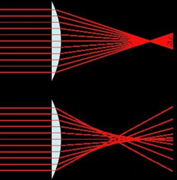 我们通常看到的透镜成像的简化图中,平行光通过透镜以后汇聚于一点,这点叫做焦点,其实真实的情况并非如此,如下图所示。