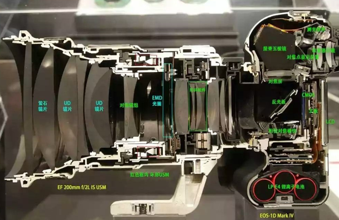 光线既然不能完美汇聚,也就不可能产生锐利的成像。当光圈大(光圈F值小)的时候,透镜接收光的圆面很大,于是光线的汇聚处会非常分散,造成成像不锐利。当光圈缩小的时候,透镜接收光的圆面很小,这时候光线经过透镜以后,汇聚处相对来说更集中一些,这样成像也就更加锐利了。一般来说对焦不会非常准确,光圈小的时候景深更深,也会显得更锐利。对于实际的镜头来说,镜头内部的镜片是很复杂的,可能有几片甚至十几片镜片,有些镜片的材质还较为昂贵,例如萤石,它们的主要作用其实就是改善镜头的光学素质,校正各种球差、彗差、色散、畸变等等。例如EF200mmf/2LISUSM镜头如下图所示。