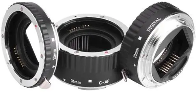 其中,p是物距,p’是像距,f是焦距。以手机拍照举例,你可以对半米远的茶杯对焦,也可以对50米外的高楼对上焦。但是有些定焦微距镜头却不可以,例如它只能对10厘米处的物体对焦,在其他距离上都不能对上焦。从上面的公式可知,当物距(p)很大的时候,1/p接近于0,此时焦距(平行光入射时从透镜光心到光聚集之焦点的距离)约等于像距。也就是说此时焦点和像面(底片)重合。我们通常认为定焦镜头的焦距不变,但值得注意的是焦距是在平行光入射的情况下定义的。另外一种准确的说法是定焦镜头像距不变、视角不变。普通定焦镜头可以认为焦距不变。例如50mmF1.8,它的最近对焦距离是450mm,物距比450mm小一点点。根据上面的公式,此时1/p就非常小了,可忽略,此时p’≈f,即焦点落在像面上。可认为焦距基本不变。但是对于佳能“百微”和尼康“105微”这样的微距镜头来说,最大放大比例是1倍,此时对焦距离就很近了,此时相对于焦距来说,1/p就不可以忽略了,这时算出来的实际的透镜焦点到光心的距离就不等于之前的焦距了。对于“百微”和“105微”这样的镜头来说,由于其极特殊的光学结构,既可以在无穷远处合焦,也可以在很近的“不同”位置合焦。这是靠移动镜头内部的多组镜片组实现的。以单反加装近摄接圈(如下图所示,用于拉长法兰距,即镜头卡口到相机底片的距离)为例,如果是50mm定焦镜头加近摄接圈,那么镜头的合焦距离就是一个确定的距离。如果是18-55mm变焦镜头加近摄接圈,那么镜头的合焦活动范围就是很小的一段距离。