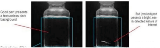 在这个应用当中,用暗场照明来创立一个明亮的,在暗背景下容易检测的感兴趣特征。在一个暗场区域中光线直接通过透明的瓶子。大多数穿透透明对象的光线不会被相机检测到。如果材料不规则,比如有裂纹,一些光线就会凸显出这个不规则。特别是划痕创立了一个内部空缺,这里光线折射和反射,以许多角度散射包括返回给相机。这些光线将很难检测的划痕转换到暗背景下的亮特征。