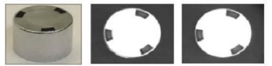 为了验证装配问题,使用蓝光波长的打亮芯片方位。这个照明技术依靠波长和同轴照明几何。蓝色波长(460纳米)能很好地区分银质和铜质表面:铜吸收蓝光呈现出暗场,银反射蓝光呈现亮场。同轴照明几何消除错误反射:不想要的耀眼点,反射和暗点。