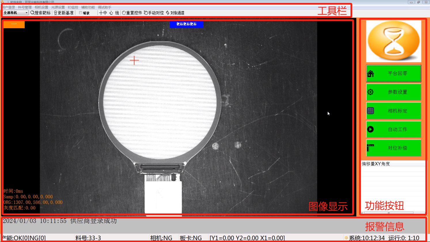 运行WiseAlign.exe程序,进入软件可以看到,主界面主要分4个区域(左上角:工具栏;右侧:功能按钮;中间:图像显示;下侧:报警信息)