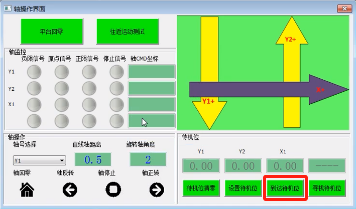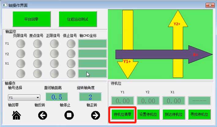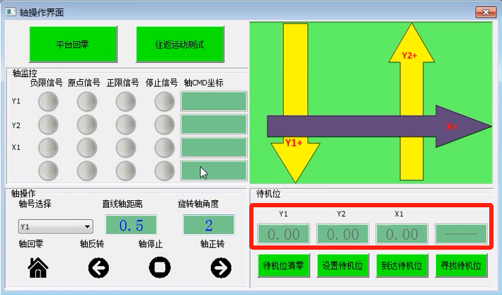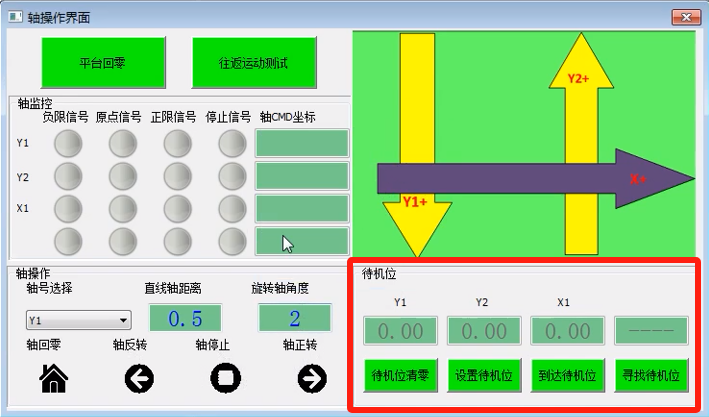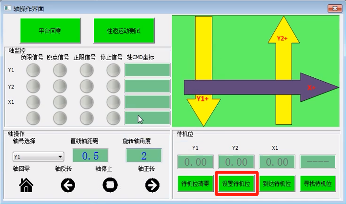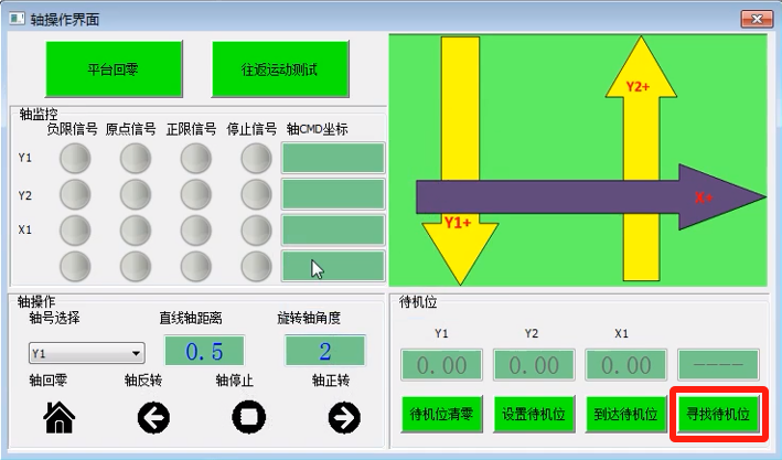 5. 寻找待机位:目前支持XXY/XYY平台,主要功能:各轴自动碰正负限位后,计算出正负限位正中间的位置并且运动到该位置,运动完毕后如果该位置满足项目需求的工作位,点击“设置待机位”将当前位置记录为待机位并保存于文件中;