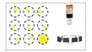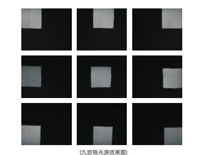 从以上分析,我们采用八个条形光源分时曝光工件,设计出以下打光方案。