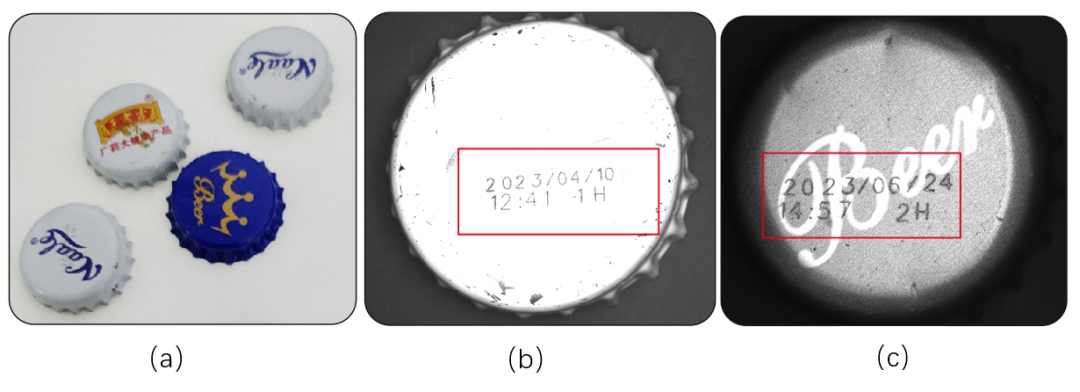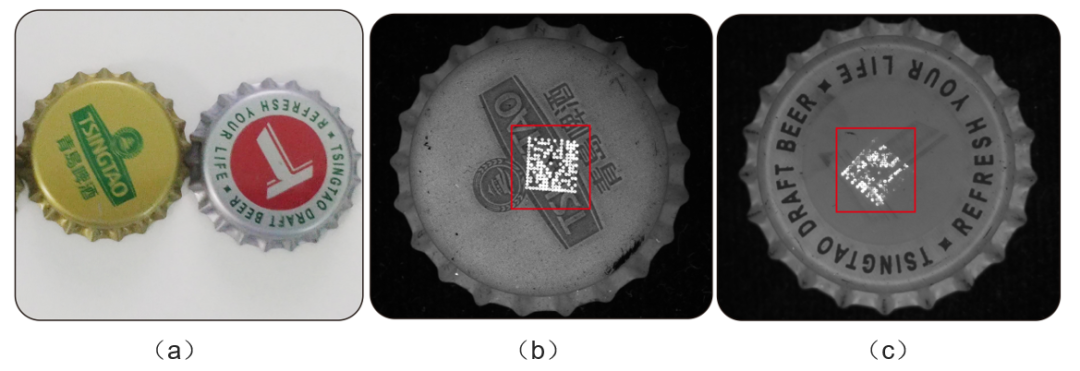 图4:(a)被检测瓶盖实物图;(b)(c)采用低角度环形光源,使背景呈灰白色,字符图案为灰色,防伪二维码为白色。