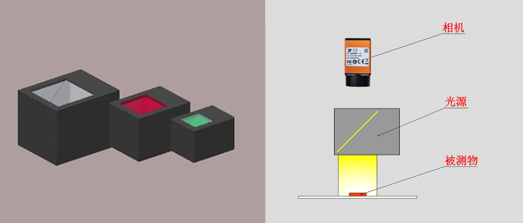 该案例需要检测具体不同颜色的瓶盖上的日期字符。这项检测任务的难点在于瓶盖上的颜色种类较多,背景干扰大(见下图a)。采用多种类型光源测试后,最后确定采用垂直光路的同轴光源(见图2)。