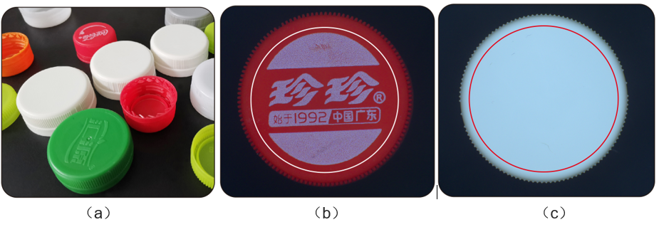 图5:(a)被检测瓶盖实物图;以及合格(b)和不合格(c)的产品。