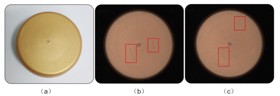 图8:(a)被检测瓶盖实物图以及(b)(c)表面划痕缺陷检测。