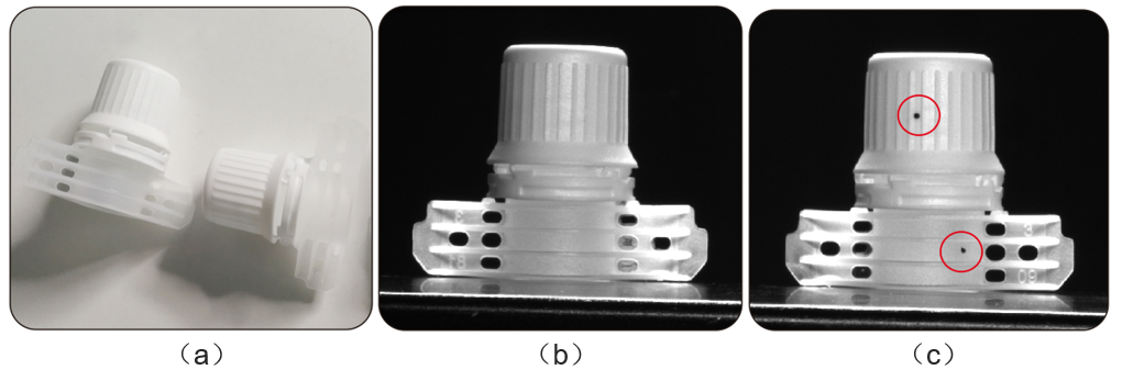 图10:(a)被检测吸嘴盖实物图以及(b)干净无瑕疵的产品和(c)有脏污的产品。