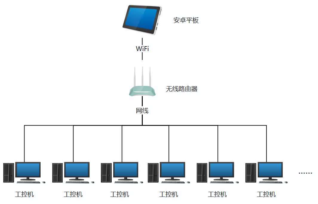 一、将所需要远程控制的工控机通过网线连接到具有WiFi功能的路由器上,将安卓平板连接上WiFi,如下图所示