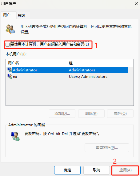取消勾选要便用本计算机,用户必须输入用户名和密码