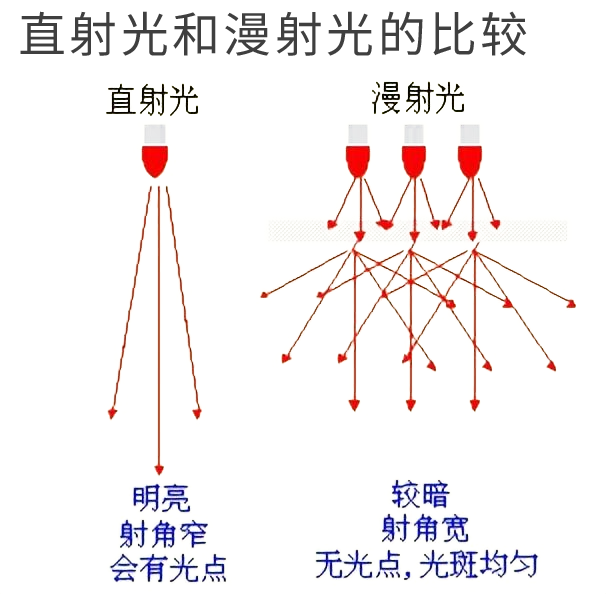 直射光:入射光基本上来自一个方向,射角小,它能投射出物体阴影;