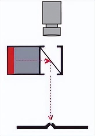 5. 同轴照明:同轴光的形成--通过垂直墙壁出来的发散光,射到一个使光向下的分光镜上,相机从上面通过分光镜看物体。