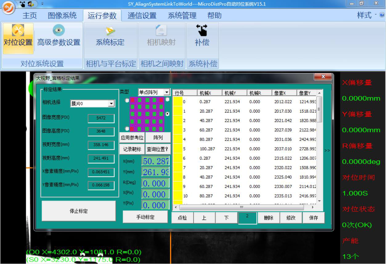系统采用宫格标定,自定义行列数和间距及旋转角度,通过机械手发送的当前机械坐标,视觉软件自动计算出宫格机械坐标,视觉软件与机械手进行网口通讯,机械模组吸取物料到达指定的机械坐标,相机拍摄物料计算出像素坐标和机械坐标的关系。
