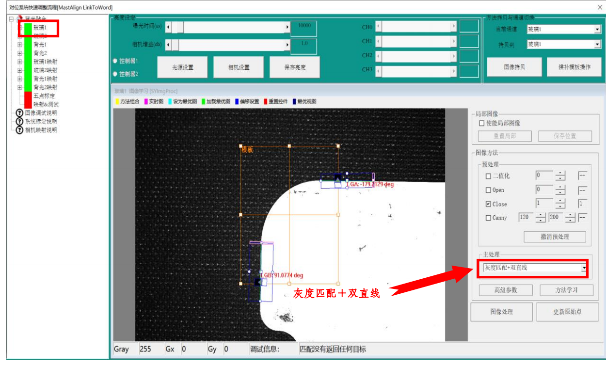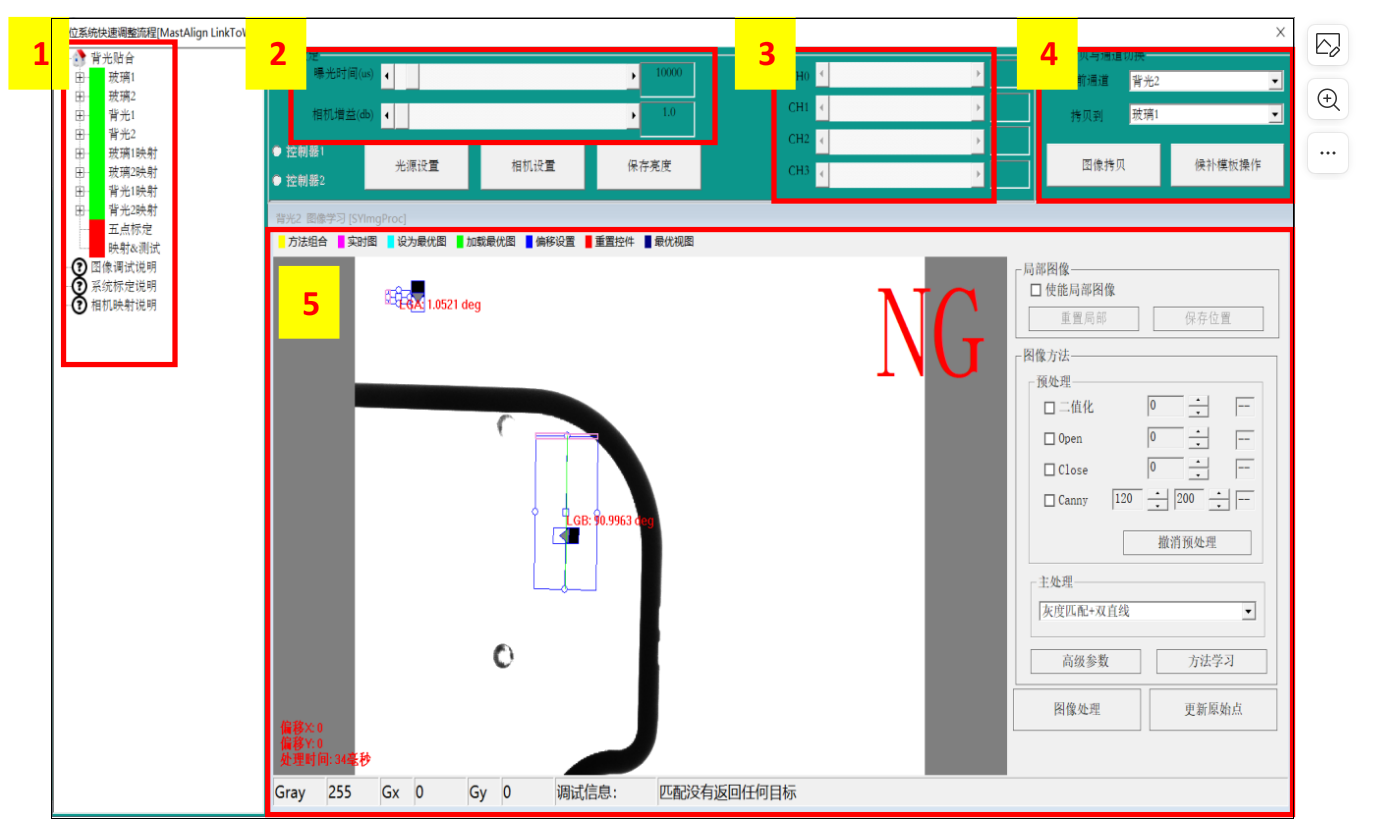 1:调试流程树状图,调试哪个通道就点击对应的名称,然后相机参数、光源亮度和模板学习都是针对当前选中的通道进行的。