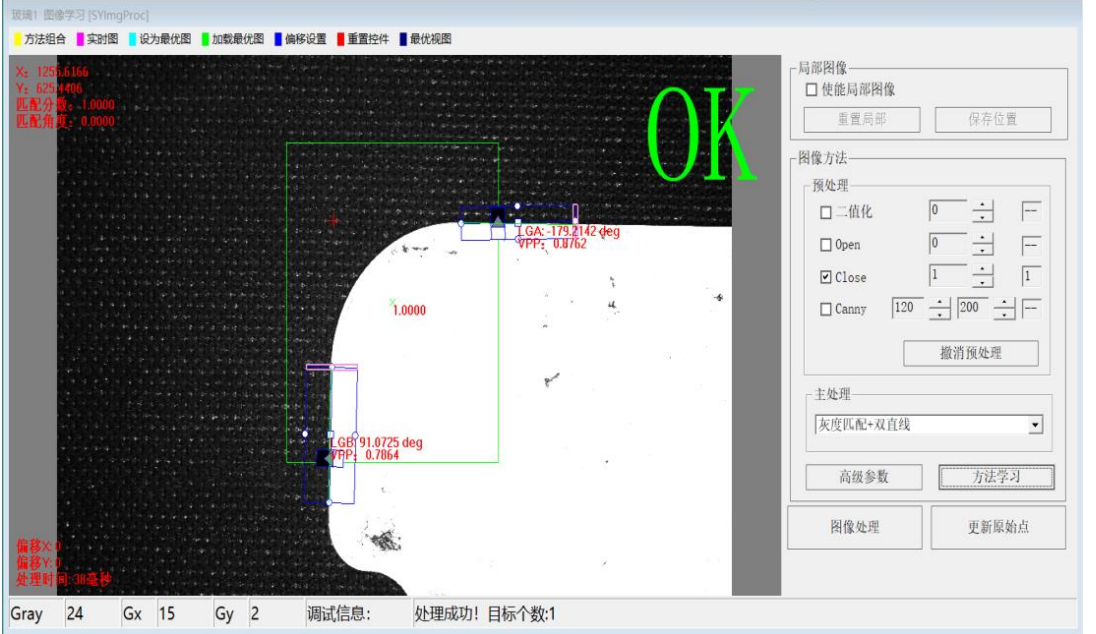 下拉重新选择“灰度匹配+双直线”,黄色的模板框工具和蓝色的直线工具则会显示出来,通过拖拽调整先使两个直线工具的中线分别与产品的水平边和垂直边的边缘相接,然后调整模板框位置和大小到合适。,再点击“方法学习”,则学习记录当前的模板。注意直线工具的极性和找边方向