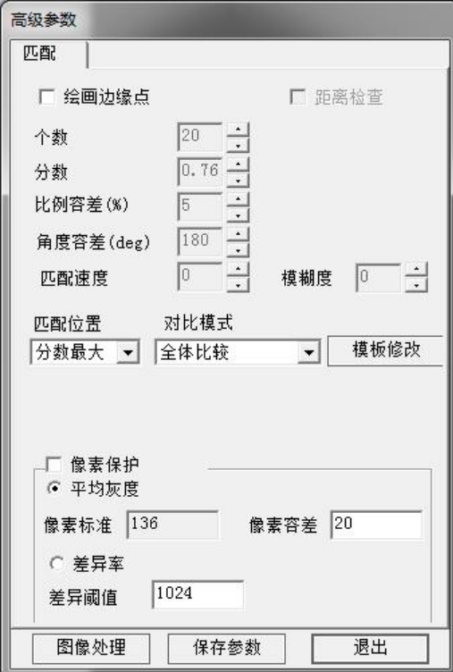 调整高级参数。点击“高级参数”,进入高级参数界面,调整参。可根据实际情况修改“分数”、“角度容差”、 “有效点比例”、“直线夹角误差”等参数