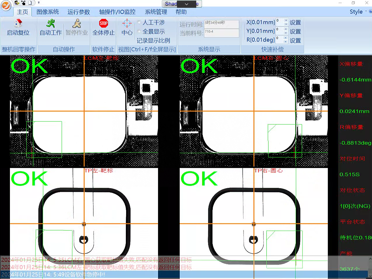 视觉定位系统采用打正向光方式,通过相机拍摄抓取LCM的相应特征坐标,并以此坐标作为基准位置;另外以个相机拍摄抓取TP相应特征位置坐标,得出盖板和LCM的位置差异,控制运动平台进行X、Y、和θ方向的调整,最终完成对位的调整,保证盖板左、右角点分别和LCM的左、右角点均分居中。
