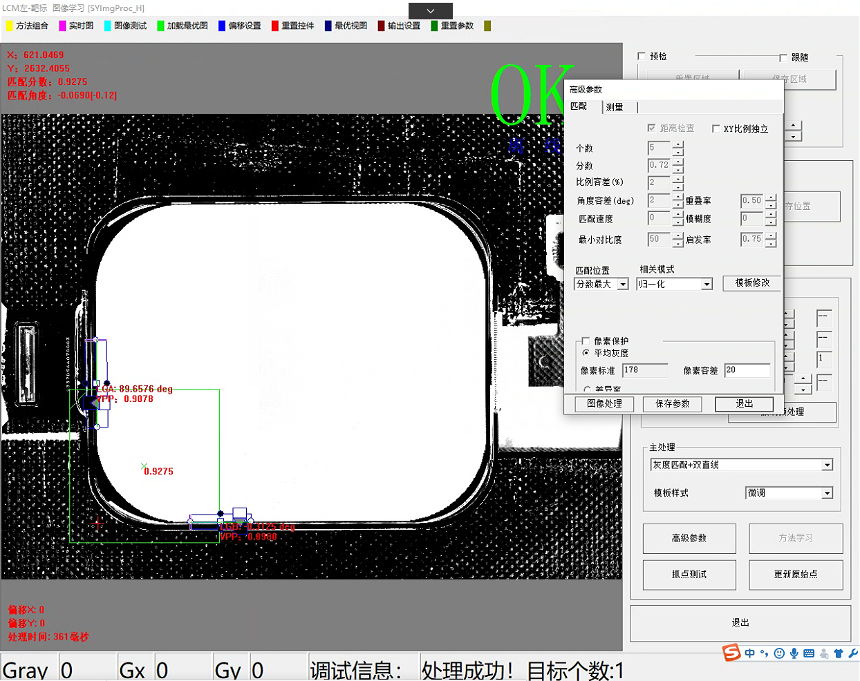 分数:和学习目标模板分数的相似度,建议分数0.5左右。 比例容差:学习的目标模板和查找产品的大小比例,建议1至2 左右。