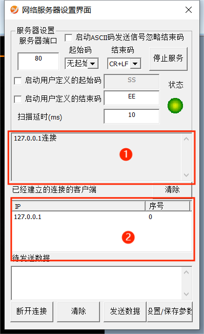 端口参数:①可以看到连接、断开、接收的数据