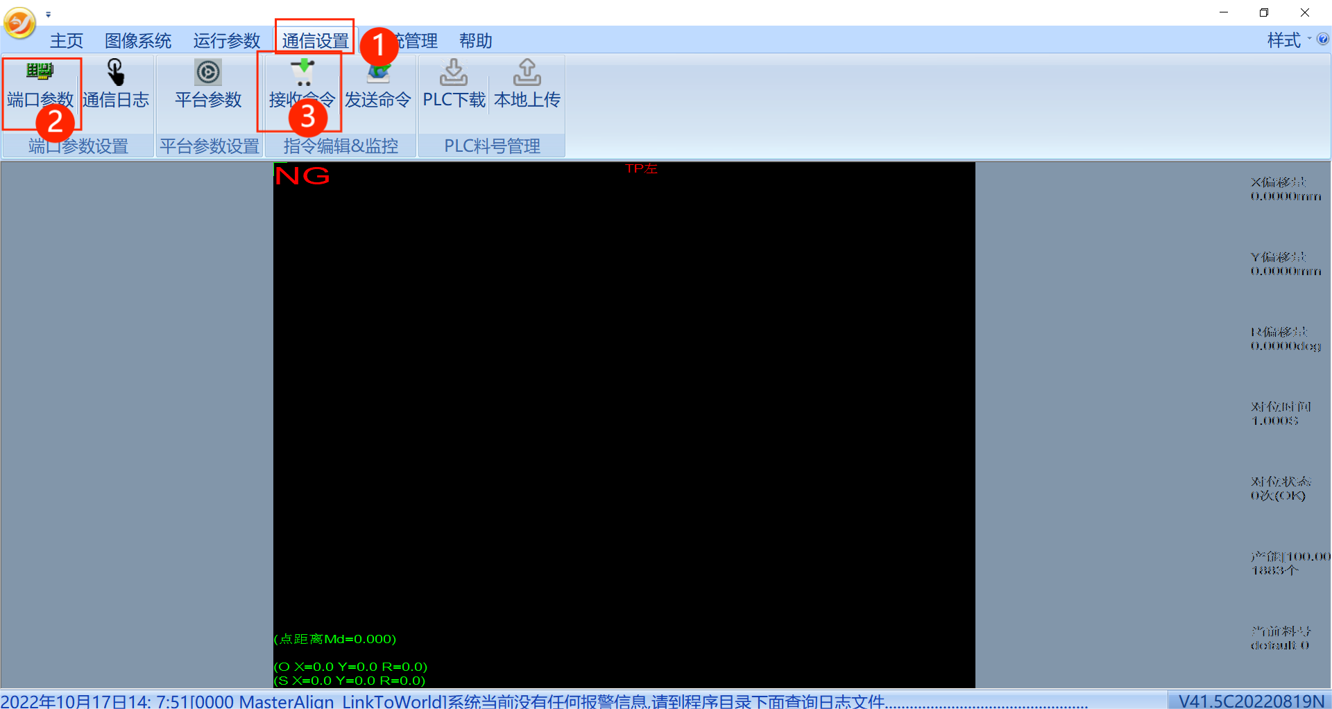 ①是一个流程的运行时间,由机器人发信号到视觉返回信号为一个通讯流程,时间是由时、分、秒、毫秒组成,例如图中14/24/34/635 就是14时24分34秒635毫秒