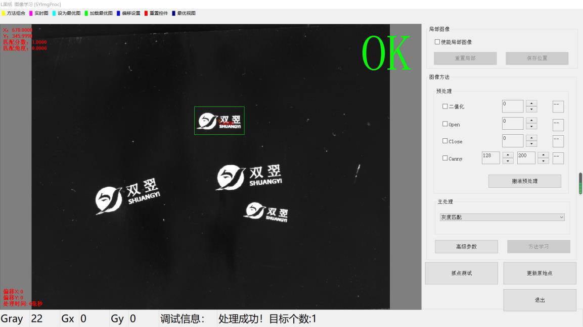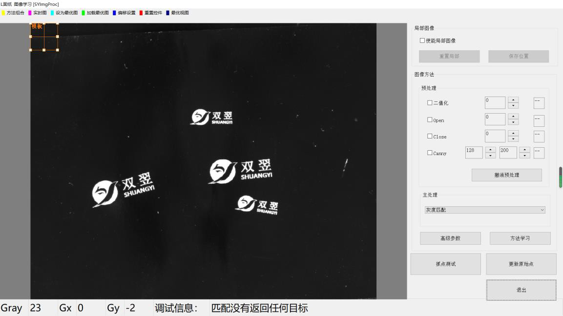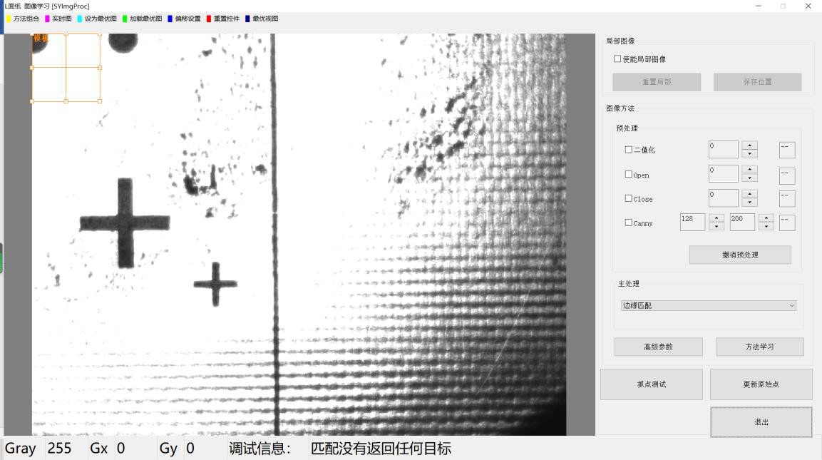 【1】在主处理下拉列表中选择《灰度匹配》,在图像范围内将出现一个橙色矩形框。如未见矩形框,可点击图像上方工具栏《重置控件》。