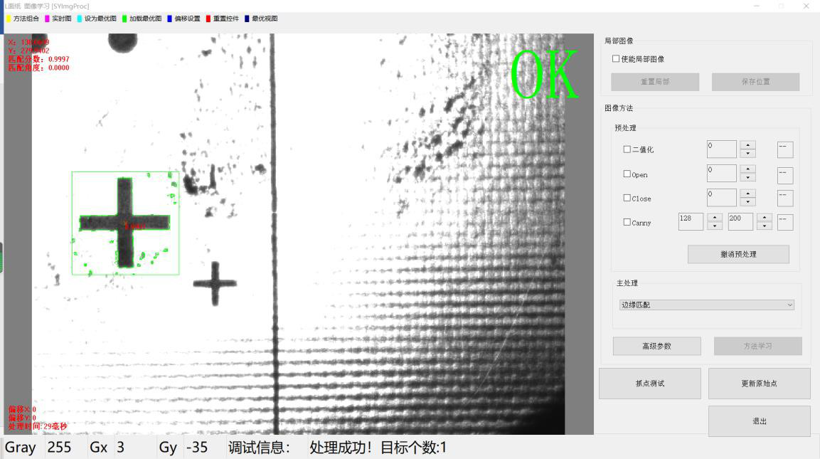 点击【方法学习】,橙色区域的局部图像作为模板被学习并保存,并自动执行图像处理并显示结果。