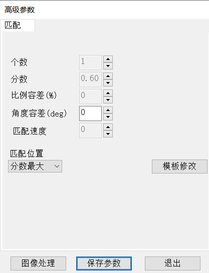 通过鼠标操作 ROI 选定模板,进入【高级参数】设置匹配角度范围,最小相似度分数,并可修改模板。