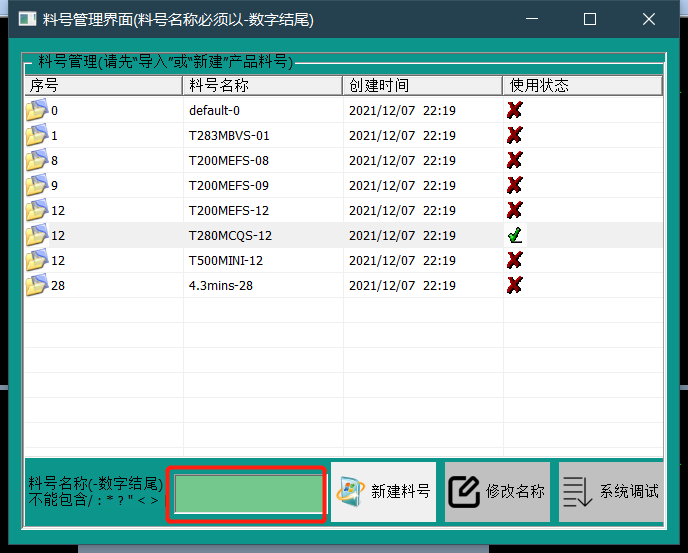 3、在框内填入需要新建的料号名称,后点击“新建料号”,会创建一个新的料号,并将当前使用的料号所有数据复制到新料号内。点击“修改名称”会将当前选择的料号名称改为您所填入的新料号名称;