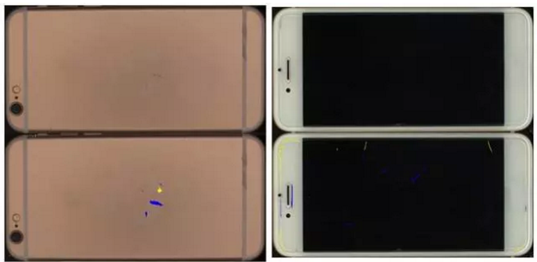 手机、平板电子产品在组装完成后,为保证出货前的产品质量,需对手机的玻璃面、后盖、侧面、圆弧面进行全方位的检查,检测内容包括划伤、缺口、点状异物(如颗粒、玻璃珠、气泡等)、压痕、凹凸痕、锯齿状、脏污、电镀掉漆、异色等。使屏幕依次显示不同的纯色背景,检测屏幕亮点、暗点、花屏、背光不良等缺陷。
