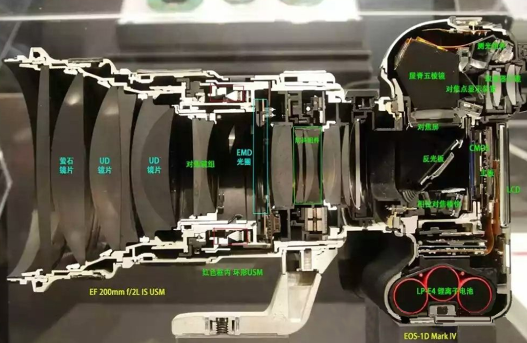 对于实际的镜头来说,镜头内部的镜片是很复杂的,可能有几片甚至十几片镜片,有些镜片的材质还较为昂贵,例如萤石,它们的主要作用其实就是改善镜头的光学素质,校正各种球差、彗差、色散、畸变等等。例如EF200mmf/2LISUSM镜头如下图所示。
