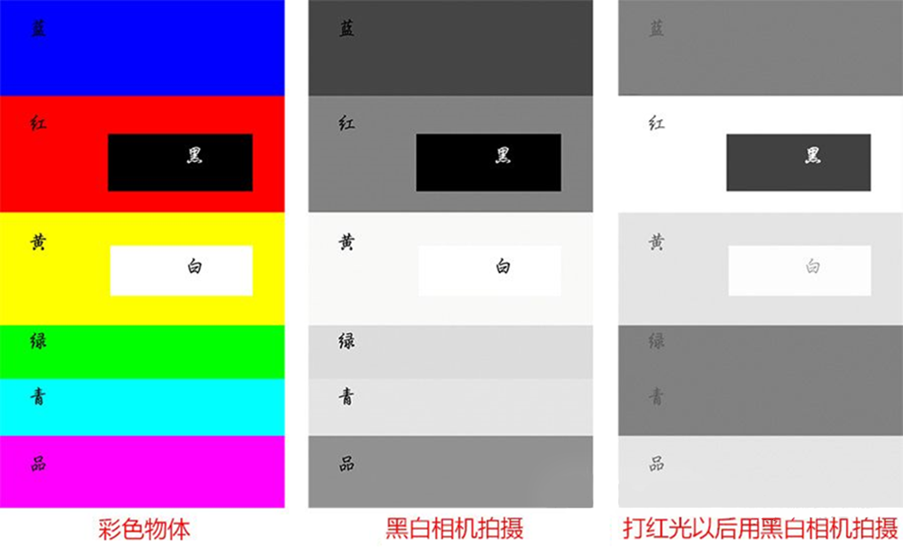 可以总结如下,用红色光给彩色物体打光,然后用黑白相机拍摄,物体红色的部分变成亮白色,物体白色部分变成浅灰色,跟红色差异大的颜色则变成暗黑色,黑色还是黑色。