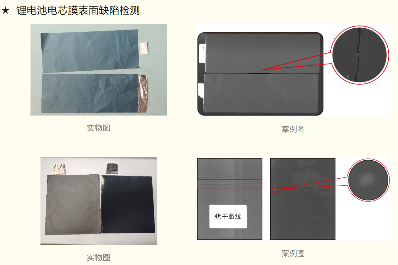 在卷膜材料中容易产生涂膜不良,刮伤、裂痕、多料、少料、杂质等问题,这些不良若流入下一环节,封装成形后会存在致命的危害,所以表面缺陷检测在锂电生产中尤为重要。